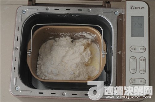 2.將液體材料放入面包機(jī)后,篩入粉類