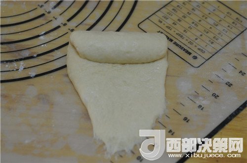 7.取一個(gè)小劑子,搟成牛舌狀后,卷起來