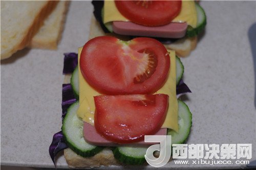 15.再放上芝士片和西紅柿片,蓋上一片土司,用油紙張包裹起來,切開即可