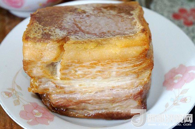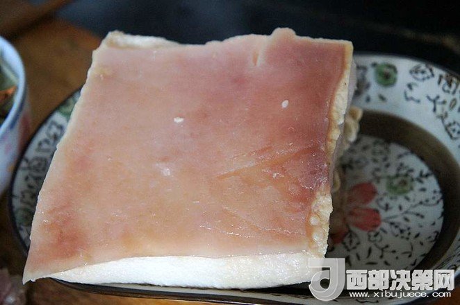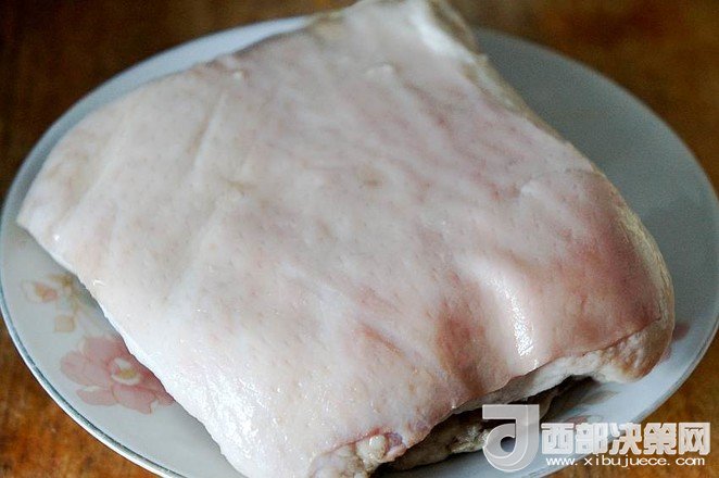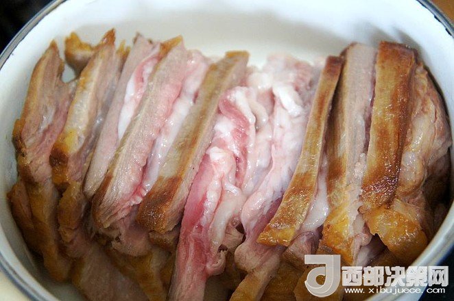 9.待五花肉稍微冷卻至不燙手時,將其切成肉片,皮朝下碼入圓底的搪瓷盆中,待用