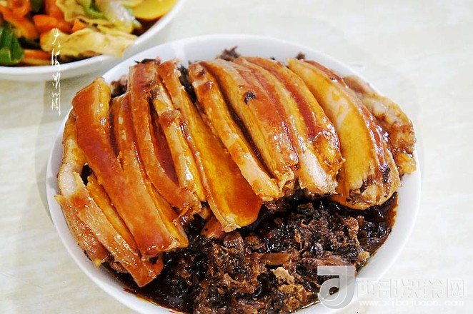 15.出鍋倒出盆內的湯汁,將五花肉和梅干菜倒扣在碗內