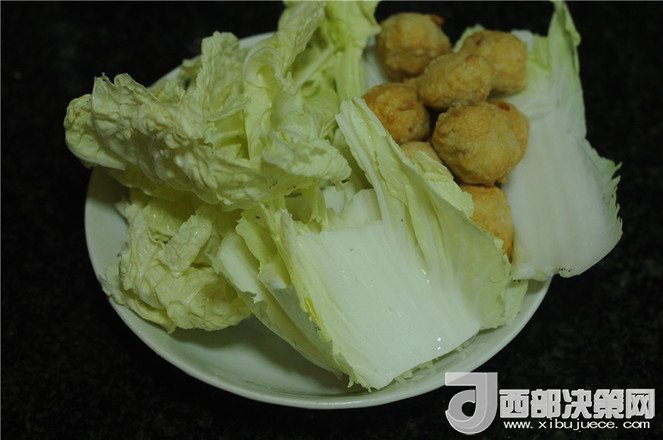 3.在泡紅薯粉絲的時(shí)候就將配菜處理好,白菜葉洗干凈,肉丸準(zhǔn)備好