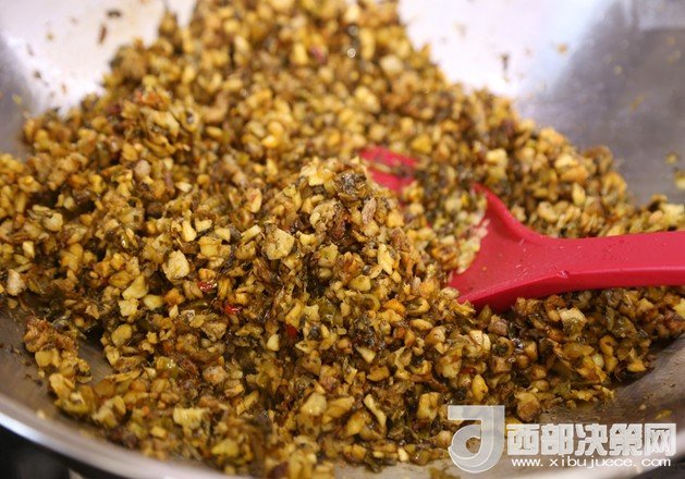 11.加入鹽菜和蘿卜干翻炒,加入適量生抽翻炒均勻。