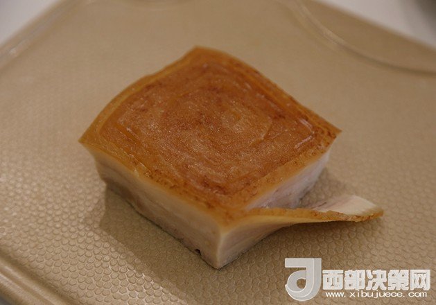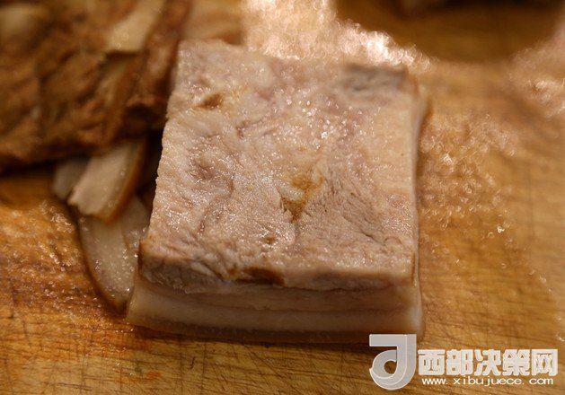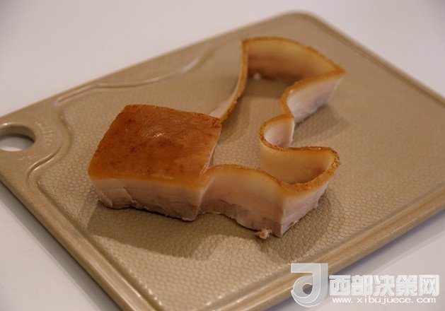 5.將肉撈出后放入冷水中過(guò)涼,然后放到平盤(pán)里上面放重物壓平整,再休整一下,然后放入冰箱冷藏凍硬,或者冷凍短時(shí)間變硬。