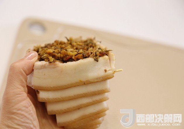 12.切好的五花肉最邊緣用牙簽固定,然后如圖手拿著,一層一層往下推,里面加入炒好的材料,多填一些,塞緊。