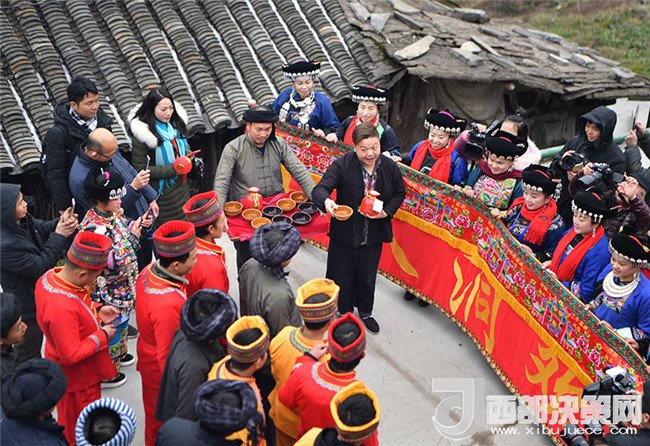 2018年2月4日,在湖南省湘西土家族苗族自治州花垣縣十八洞村,新郎的迎親隊(duì)伍遇上新娘親友攔門。當(dāng)日,兩對(duì)分別來自湘西和湘潭的新人特地來到十八洞村體驗(yàn)苗族婚禮。新華社發(fā)(薛宇舸 攝)