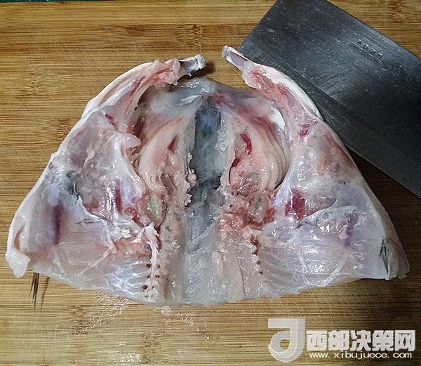 3.處理魚時(shí)注意將貼在魚肚子及魚頭里的黑膜全部撕掉并清洗干凈,要不吃起來會(huì)有很重的“魚腥味和土腥味”,然后瀝干水分后用刀將魚頭小心地劈開但不要劈斷、用蔥姜、料酒腌制半小時(shí)左右,可進(jìn)一步去腥增味