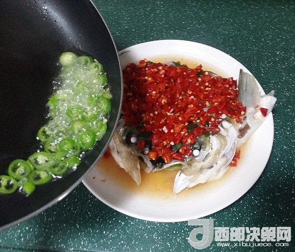 11.同時(shí)另起鍋燒熱油、下蔥花與杭椒爆香、然后趁熱淋在魚頭上