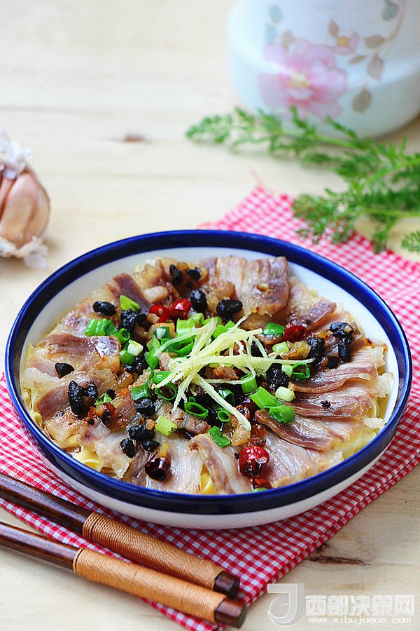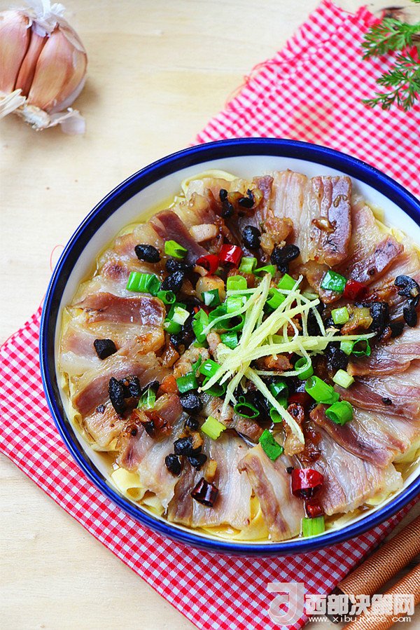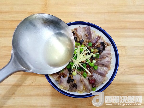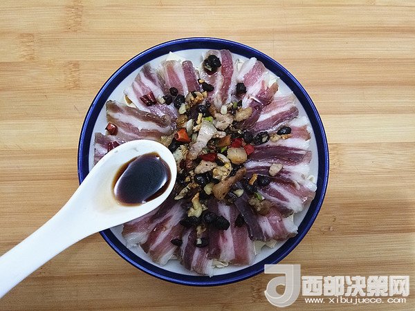 8.炒香的調(diào)料澆在咸肉上,加入適量生抽。