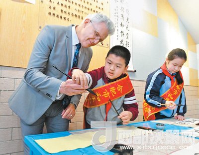 日前,加拿大溫哥華公立教育局考察團(tuán)走進(jìn)安徽省合肥市和平小學(xué)參加中外文化交流活動(dòng),親身體驗(yàn)書法、民樂和戲曲等傳統(tǒng)文化課程,零距離感受中國文化的魅力。圖為加拿大客人和和平小學(xué)的學(xué)生們一起學(xué)習(xí)書法。
