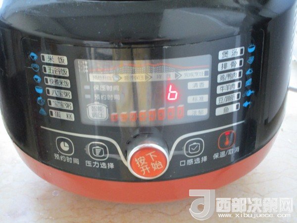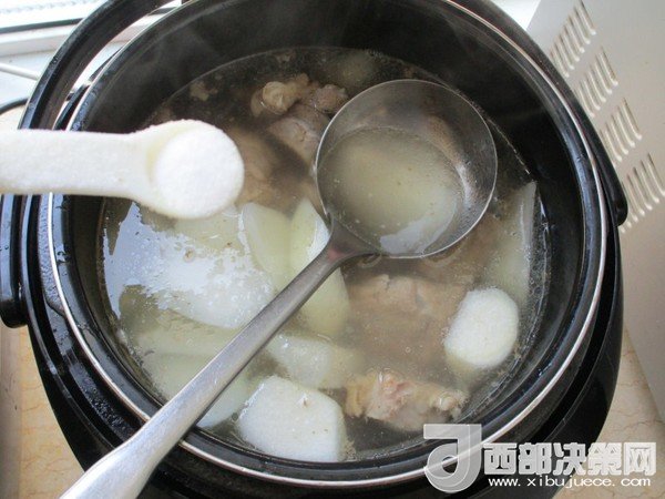 6.等時(shí)間到能打開(kāi)后開(kāi)蓋把白蘿卜加入,嘗試味道后加鹽調(diào)味,再壓5分鐘即可