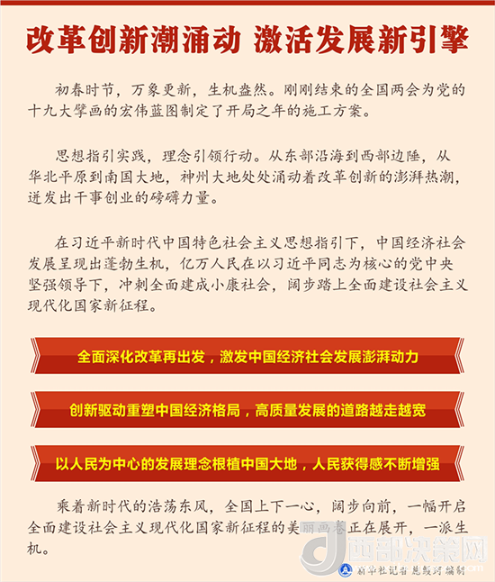 “我們要以更大的力度、更實(shí)的措施全面深化改革、擴(kuò)大對(duì)外開放,貫徹新發(fā)展理念,推動(dòng)經(jīng)濟(jì)高質(zhì)量發(fā)展,建設(shè)現(xiàn)代化經(jīng)濟(jì)體系,不斷增強(qiáng)我國(guó)經(jīng)濟(jì)實(shí)力、科技實(shí)力、綜合國(guó)力,讓社會(huì)主義市場(chǎng)經(jīng)濟(jì)的活力更加充分地展示出來。”習(xí)近平總書記在十三屆全國(guó)人大一次會(huì)議上的重要講話,再次發(fā)出了全面深化改革的號(hào)召。