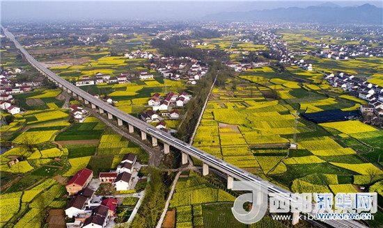 3月21日,一列動(dòng)車正通過陜西省漢中市南鄭縣新集鎮(zhèn)油菜花海(無人機(jī)拍攝)。新華社記者 陶明 攝