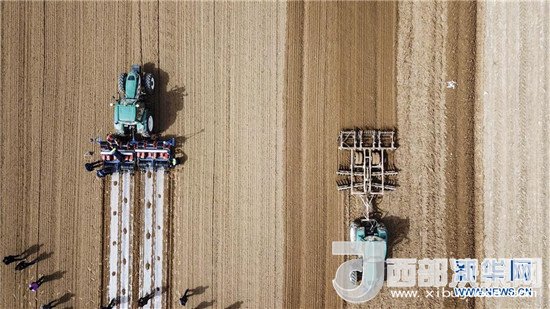 3月23日,“智能拖拉機(jī)”在新疆庫車縣牙哈鎮(zhèn)的一處棉田中進(jìn)行精細(xì)化作業(yè)(無人機(jī)拍攝)。新華社記者 胡虎虎 攝