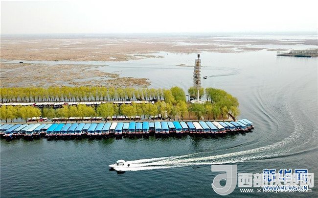 一艘游船在白洋淀景區(qū)旅游碼頭內(nèi)行駛(3月30日無人機拍攝)。新華社記者 牟宇 攝