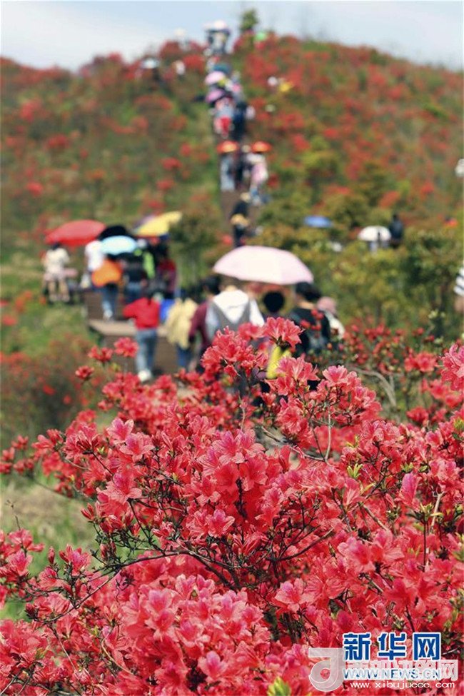 4月10日,游客在安徽銅陵鐘鳴鎮(zhèn)杜鵑山上賞花游玩。 新華社發(fā)(過(guò)仕寧 攝)