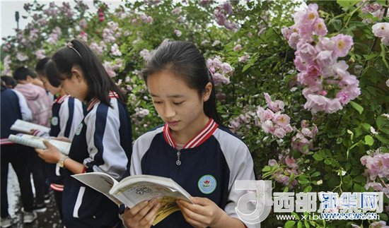 木魚中學的學生們在校園的鮮花叢中閱讀課文(4月24日攝)。
