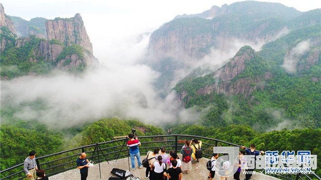 5月1日,游人在浙江省仙居縣神仙居景區(qū)游覽。當(dāng)日,雨后的神仙居景區(qū)云霧繚繞,山巒若隱若現(xiàn)。新華社發(fā) 王華斌 攝