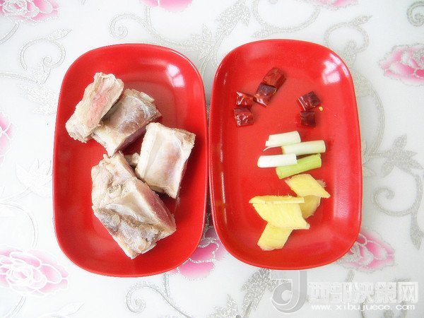 1.排骨焯洗干凈,姜切片,辣椒切小塊,蔥白段備好