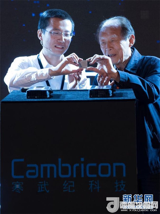 5月3日,在上海國際會議中心舉行的發(fā)布會上,寒武紀(jì)科技公司首席執(zhí)行官陳天石(左)和他的老師、中科院院士陳國良一起發(fā)布芯片。