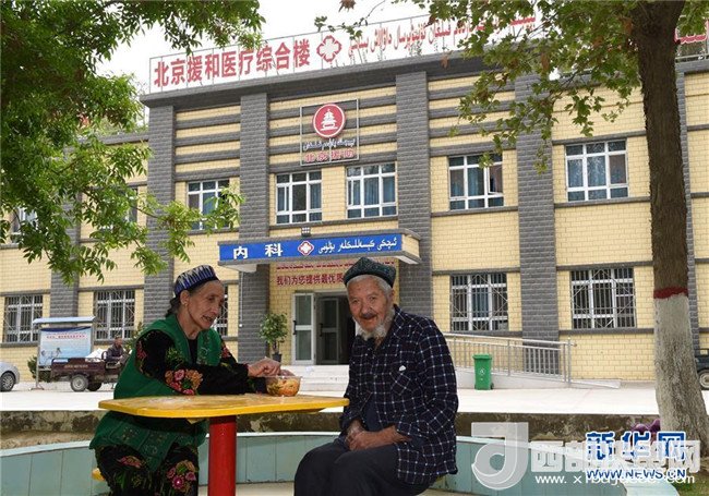 一名維吾爾族患者(右)在新疆和田縣巴格其鎮(zhèn)中心衛(wèi)生院北京援和醫(yī)療綜合樓前準備吃午飯(4月19日攝)。
