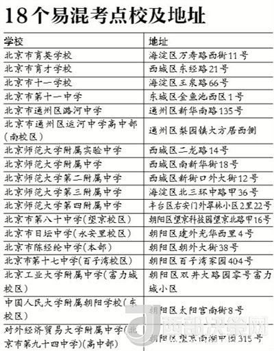 北京教育考試院公布了18個(gè)容易混淆名稱或走錯(cuò)校區(qū)的考點(diǎn)名單,共涉及4類。第一類是考點(diǎn)的名稱相似、只有一字之差的考點(diǎn),比如北京市育才學(xué)校與北京市育英學(xué)校,北京市十一學(xué)校與北京市第十一中學(xué),北京市通州區(qū)潞河中學(xué)與北京市通州區(qū)運(yùn)河中學(xué)。