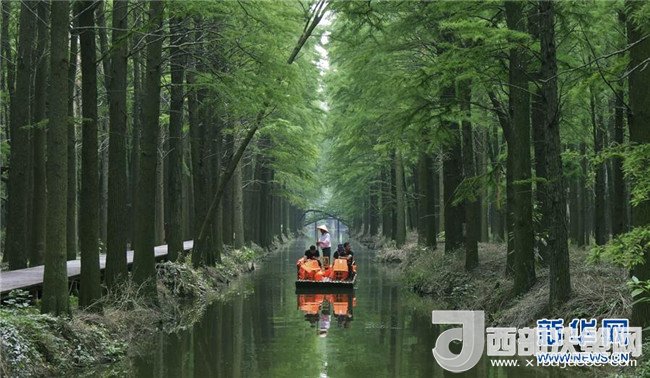 夏日時節(jié),位于江蘇省興化市李中鎮(zhèn)的水上森林公園滿目蒼翠,綠意撲面。水杉、池杉等樹木構成了一幅幅夏日畫卷,吸引不少游客前往游覽。