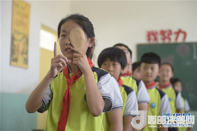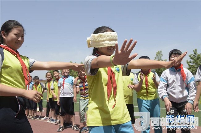 6月5日,廊坊市安次區(qū)仇莊鄉(xiāng)大王務(wù)中心小學(xué)學(xué)生在操場(chǎng)上體驗(yàn)蒙眼行進(jìn),通過游戲的方式感受保護(hù)視力的重要性。