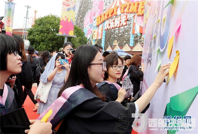 6月10日,畢業(yè)生們?cè)跉g樂谷廣場(chǎng)上拍合影。新華社記者 方喆攝