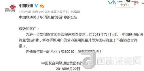 繼中國(guó)移動(dòng)之后,中國(guó)聯(lián)通也于同日通過(guò)官方微博宣布:自2018年7月1日起,中國(guó)聯(lián)通取消流量“漫游”費(fèi),新老手機(jī)用戶(hù)的省內(nèi)通用流量升級(jí)為國(guó)內(nèi)流量(不含港澳臺(tái)流量)。