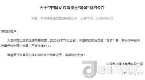 中國(guó)移動(dòng)22日在官網(wǎng)發(fā)布關(guān)于取消流量“漫游”費(fèi)的公告,公告稱(chēng),自2018年7月1日起,中國(guó)移動(dòng)取消流量“漫游”費(fèi),新老用戶(hù)省內(nèi)流量升級(jí)為國(guó)內(nèi)流量(不含港澳臺(tái))。