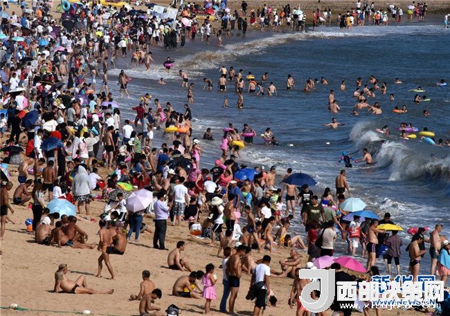 7月1日,人們?cè)谇鄭u第一海水浴場(chǎng)海灘上游玩。新華社記者 李紫恒 攝