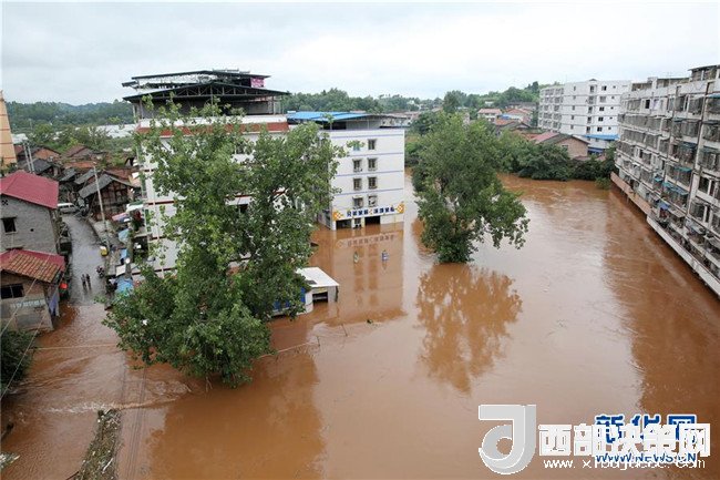 7月3日,四川省內(nèi)江市東興區(qū)田家鎮(zhèn)的小青龍河水位上漲,河邊部分民房被淹。 新華社發(fā)(蘭自濤 攝)