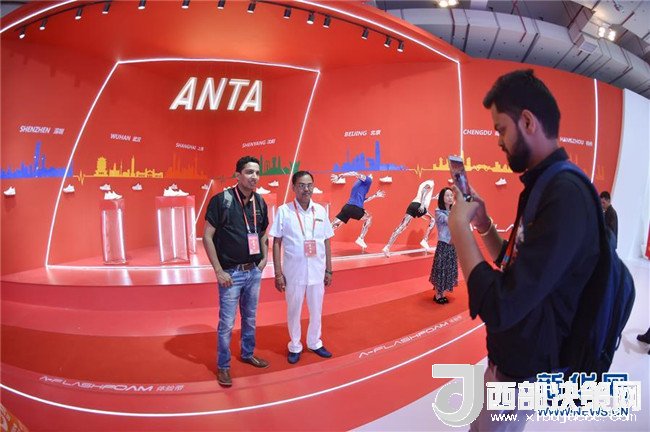在一年一度的中國(guó)(晉江)國(guó)際鞋業(yè)暨國(guó)際體育產(chǎn)業(yè)博覽會(huì)上,來(lái)自印度的客商在安踏展位前留影(4月19日攝)。新華社記者 宋為偉 攝