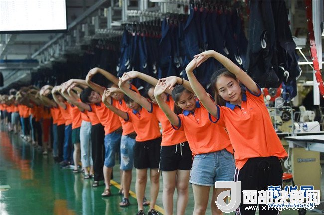 在位于晉江市的柒牌時(shí)裝科技股份有限公司黨建示范車間,工人在做工間操(6月19日攝)。新華社記者 宋為偉 攝