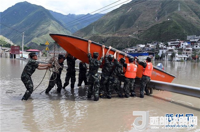 7月15日,在舟曲縣南峪鄉(xiāng),武警甘南支隊(duì)?wèi)?zhàn)士在搬運(yùn)沖鋒舟。