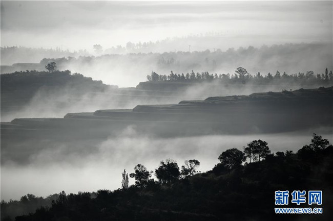 近日,寧夏固原市彭陽縣數(shù)十萬畝旱作梯田在曙光中迎來云海景觀,層疊的梯田間云霧繚繞,宛如仙境。據(jù)了解,彭陽縣自1983年建縣以來,始終堅(jiān)持生態(tài)立縣的理念,積極推進(jìn)植樹造林事業(yè),全縣林木保存面積由1983年的27萬畝,增長到目前的203.87萬畝,森林覆蓋率達(dá)到27.5%。記者王鵬攝