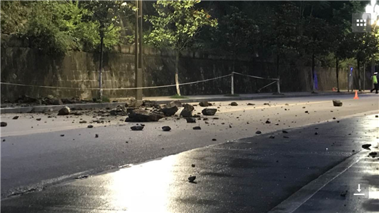 接到報(bào)警后,大隊(duì)及專職隊(duì)迅速出動(dòng)兩輛消防車和10名官兵趕赴現(xiàn)場(chǎng)進(jìn)行處置,到達(dá)現(xiàn)場(chǎng)后,指揮員迅速帶領(lǐng)4名戰(zhàn)斗員立即對(duì)險(xiǎn)情進(jìn)行偵查。通過(guò)現(xiàn)場(chǎng)偵查,發(fā)現(xiàn)在距離路面高約50米的山梁上,幾個(gè)石塊直徑約1米大小,由于連續(xù)幾日暴雨,石塊下土層已經(jīng)流失,導(dǎo)致石塊部分懸空,隨時(shí)都有掉落的危險(xiǎn)。此時(shí)已近夜晚,模糊不清的環(huán)境無(wú)形中增加現(xiàn)場(chǎng)處置的難度。指揮員下令,分兩組進(jìn)行處置,一組由5名戰(zhàn)斗員跟隨一名熟悉該山道路的群眾一起上山,處置"懸石”險(xiǎn)情,一組與交警部門拉起警戒線隔離過(guò)往車輛和行人。由于“懸石”處無(wú)路可通,戰(zhàn)斗員在上到山梁后,系上安全繩下降到懸石旁利用事先準(zhǔn)備好的鋼釬對(duì)石塊進(jìn)行起拗,在經(jīng)過(guò)兩個(gè)多小時(shí)的作業(yè)后,全部懸石終于掉落路面,使隱患徹底消除。