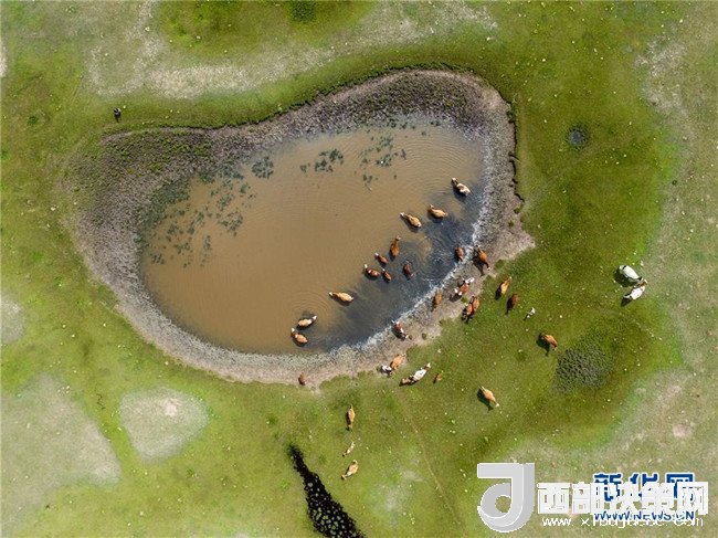 牛群在錫林郭勒盟正藍(lán)旗的草原上飲水(7月16日無人機(jī)拍攝)。