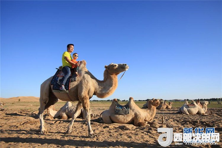 7月25日,一對(duì)父子在庫(kù)布其沙漠七星湖景區(qū)體驗(yàn)騎駱駝。 新華社記者 盧燁 攝