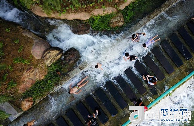7月29日,市民在廣西柳州市窯埠古鎮(zhèn)人工瀑布群下消暑納涼(無人機拍攝)。