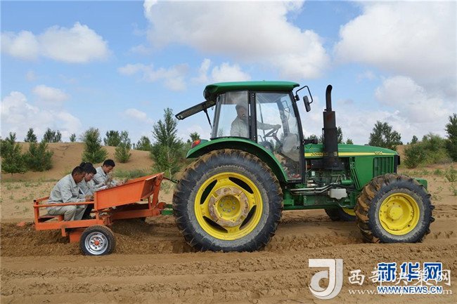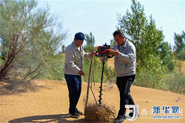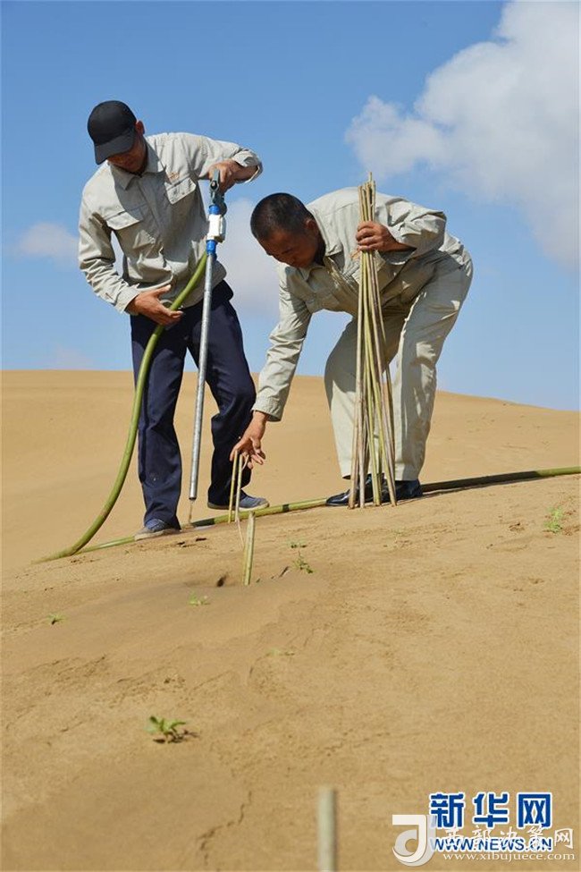 億利集團(tuán)生態(tài)事業(yè)部職工在庫布其沙漠中利用螺旋鉆孔植樹法種樹(7月11日攝)。用這種方法30秒可種下一棵樹。 新華社記者 彭源 攝