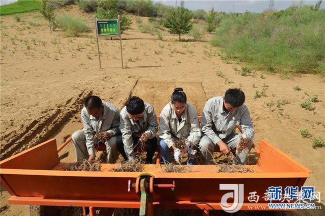 技術(shù)人員在位于內(nèi)蒙古鄂爾多斯市杭錦旗的庫布其沙漠示范甘草平移法(7月24日攝)。