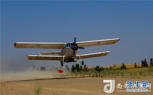 在內(nèi)蒙古鄂爾多斯市的庫布其沙漠腹地,一架飛播造林用的飛機(jī)起飛(7月11日攝)。  新華社記者 彭源 攝