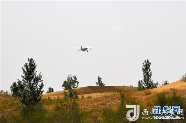 在內(nèi)蒙古鄂爾多斯市的庫布其沙漠腹地,一架飛播造林用的飛機(jī)飛向沙海(7月11日攝)。 新華社記者 彭源 攝