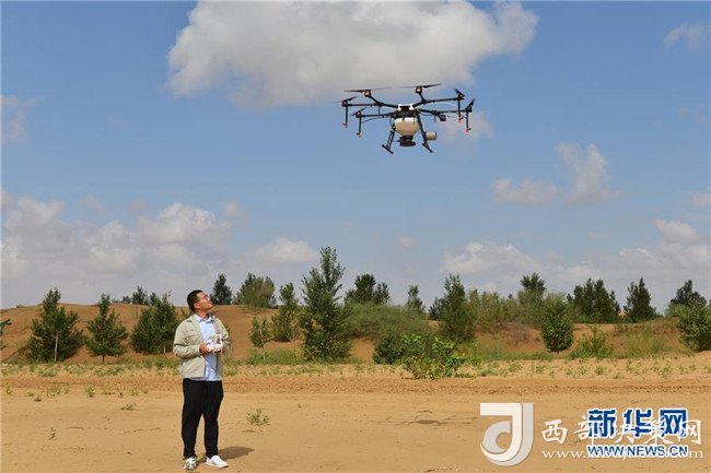 技術(shù)人員在內(nèi)蒙古鄂爾多斯市杭錦旗的庫布其沙漠里操控?zé)o人機(jī)飛播造林(7月11日攝)。 新華社記者 彭源 攝