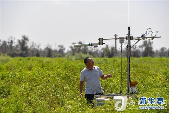 在內(nèi)蒙古鄂爾多斯市的庫布其沙漠中的億利集團(tuán)阿木古龍甘草健康產(chǎn)業(yè)園,工作人員在儀器前觀測氣候土壤條件(7月11日攝)。 新華社記者 彭源 攝