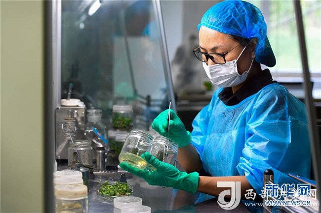 在億利集團(tuán)庫布其生態(tài)科技中心的沙生植物育苗實(shí)驗(yàn)室內(nèi),科研人員進(jìn)行組培試驗(yàn)(7月11日攝)。 新華社記者 彭源 攝