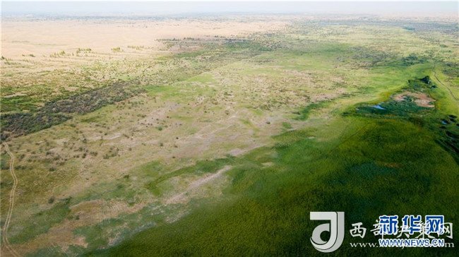 這是內(nèi)蒙古鄂爾多斯市杭錦旗庫布其沙漠中的生態(tài)修復(fù)現(xiàn)狀(7月11日無人機(jī)拍攝)。  新華社記者 彭源 攝