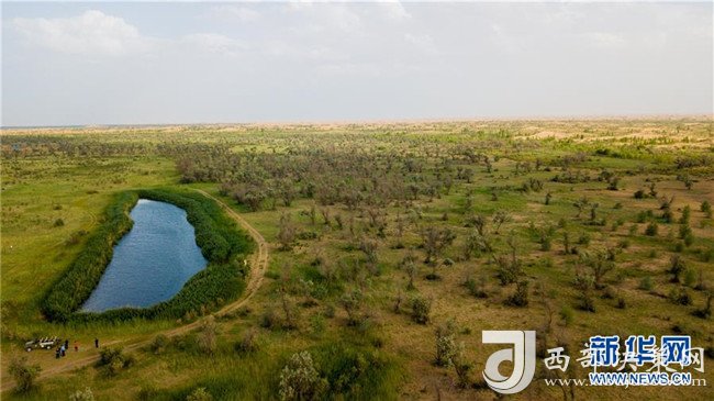 這是位于庫布其沙漠中的七星湖沙漠生態(tài)旅游區(qū)(7月11日無人機(jī)拍攝)。  新華社記者 彭源 攝